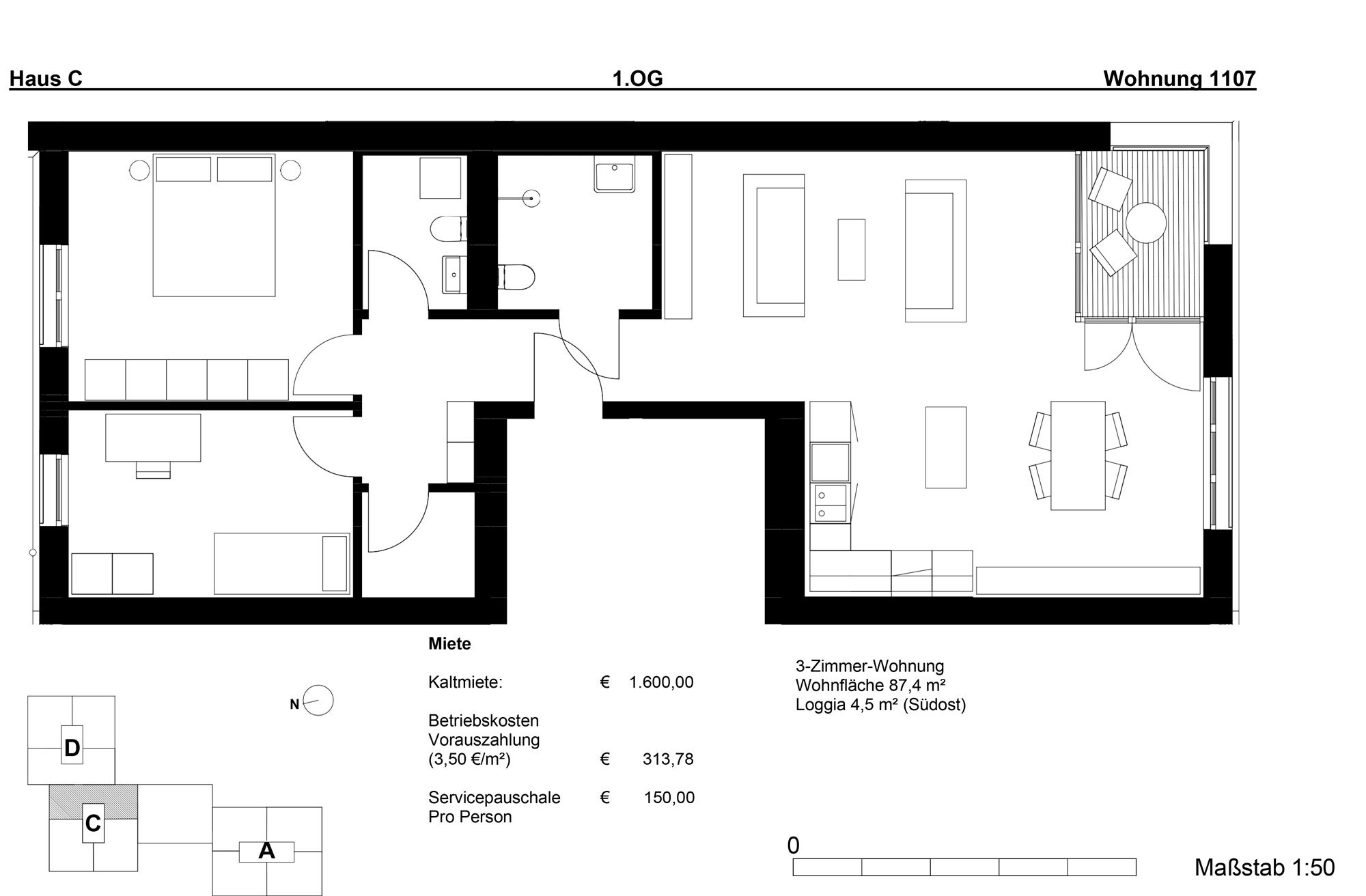 | C | 1 | 1107 | 87.00 | 3-Zimmer-Wohnung | frei | Südost | DIN 18040-2 | Kein R-Standard | 3 Zimmer | |