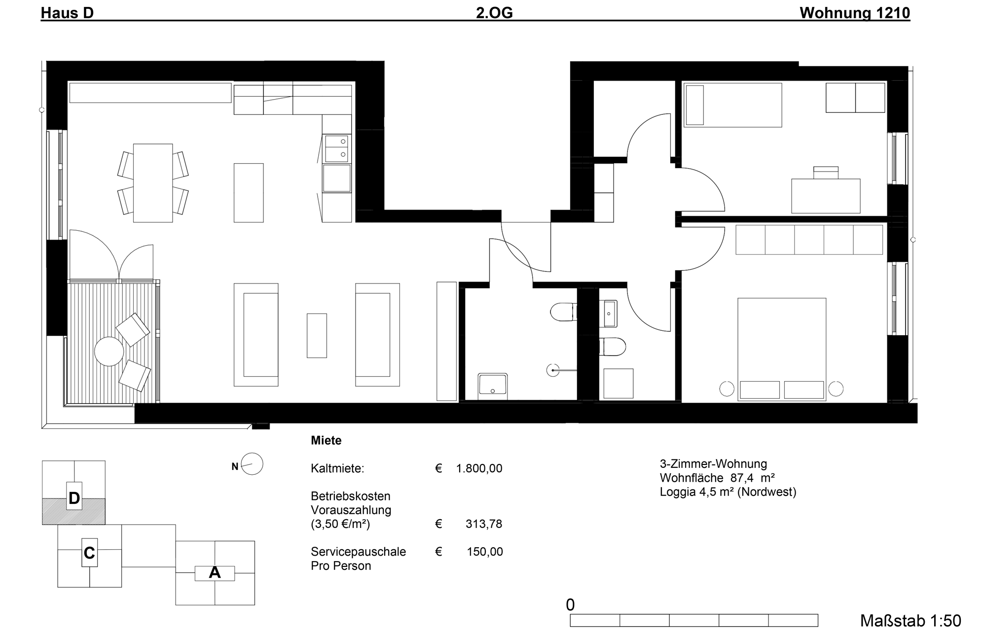 | D | 2 | 1210 | 87.00 | 3-Zimmer-Wohnung | frei | Nordwest | DIN 18040-2 | Kein R-Standard | 3 Zimmer | |